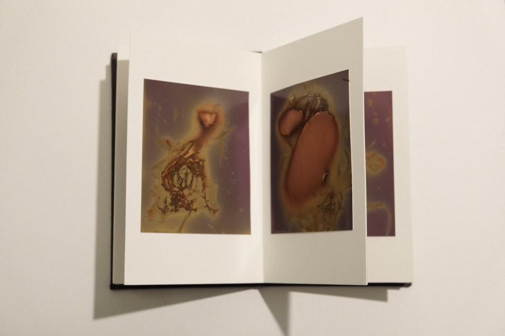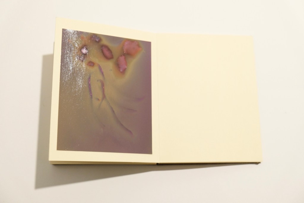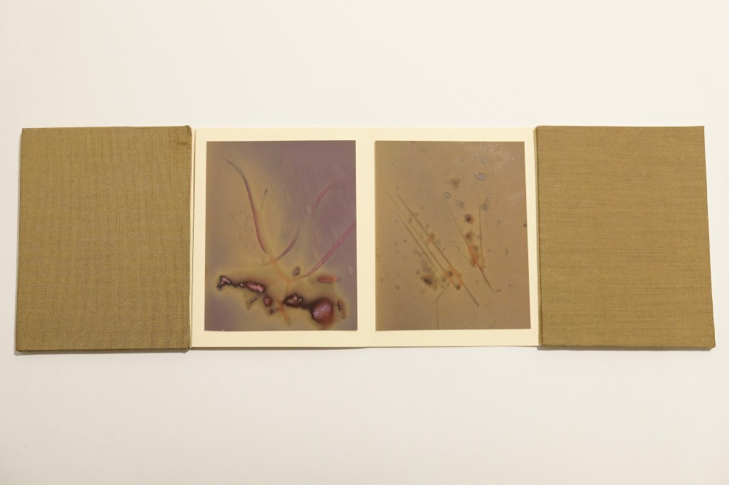 Untitled, 2025 — handmade, hardbound, accordion style, 22 pages, 20 unique Polaroid emulsion lift cut out compositions tipped in, Arches 100% cotton watercolor paper, unique, 8 x 10 inches.