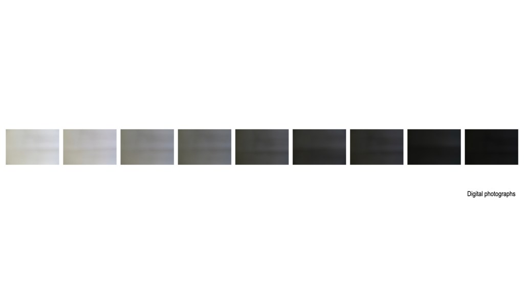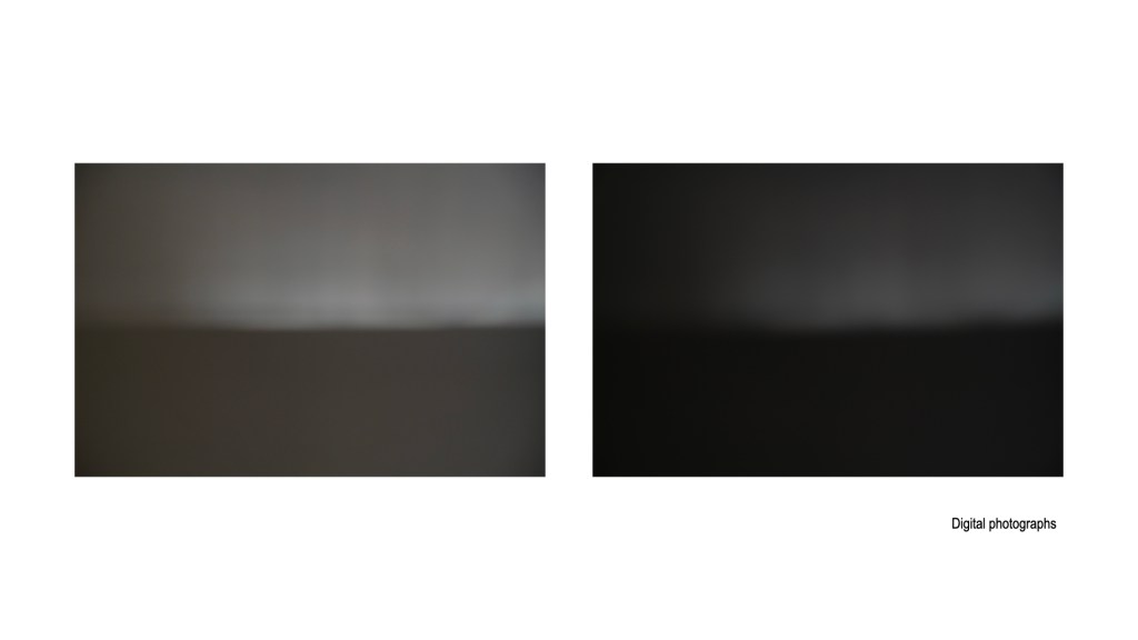 Thinking about the different colors that the digital sensor creates in response to an object on a white background, I thought I would play with that idea and create images of a strip of white paper with a line of black ink residue—a glitch horizon. I zoomed in on this faux horizon line and adjusted the exposures repeatedly to see what the sensor would pick up. Surprisingly, the images revealed a blue cast.