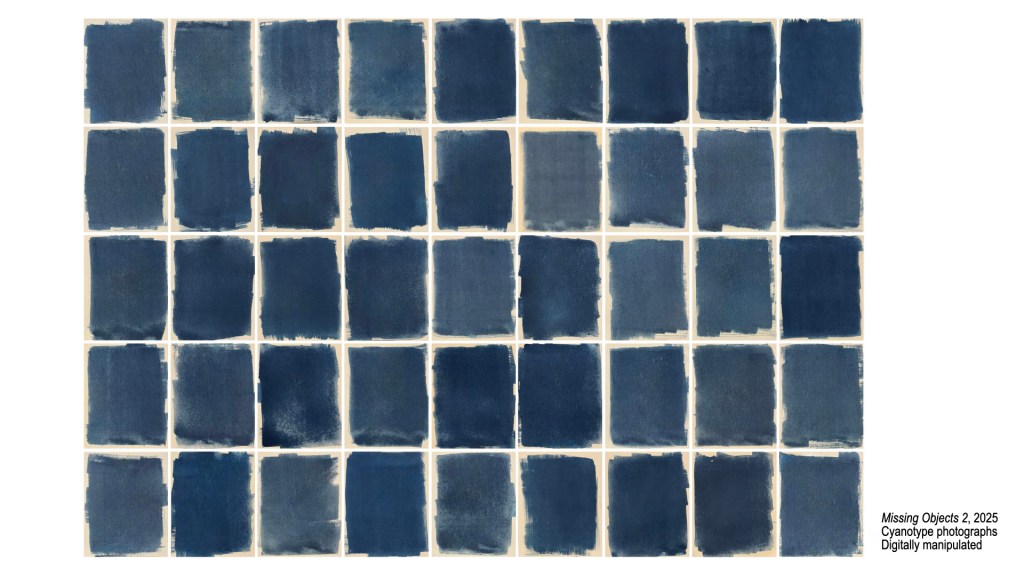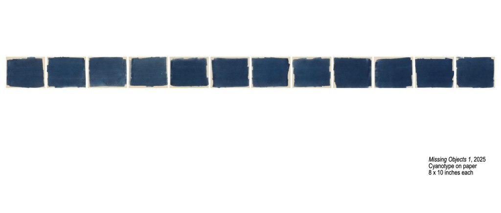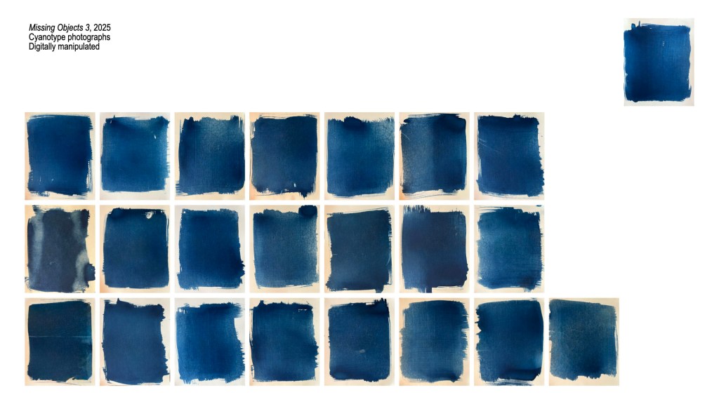 At first I eliminated the object altogether while still utilizing the cyanotype process. I began thinking about the color blue which runs through my work. Then I started thinking about removing the object digitally on the images from Holding. as I was starting to investigate digital photography processes more.